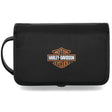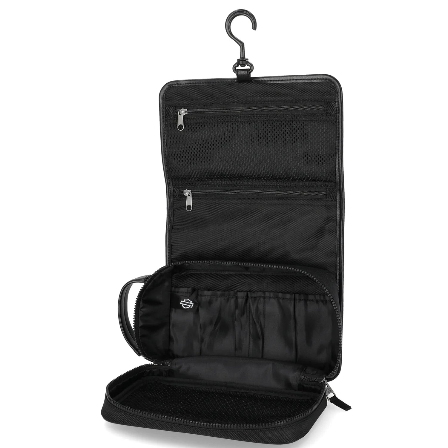 The Harley-Davidson Travel Hanging Kit offers a durable and expertly designed solution for organized travel. Crafted from large polyester in black, it measures 10" x 3.75" x 6" and features an antique nickel finish with a matte black hanging hook for easy setup. Inside, an interior zipper mesh pocket and a spacious main compartment with multiple sections keep your essentials neatly arranged. A sturdy grab handle adds convenience, making this kit ideal for travelers who value both functionality and style.