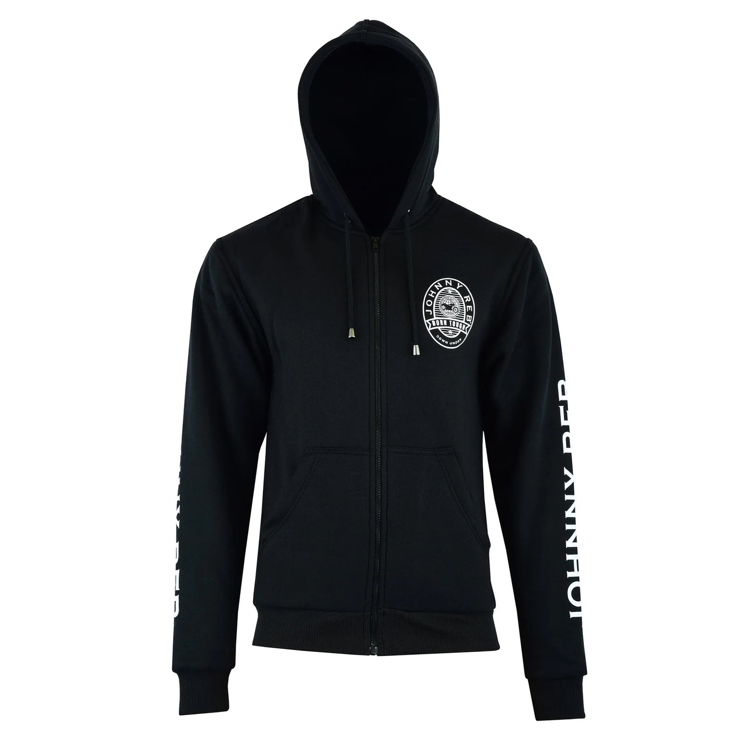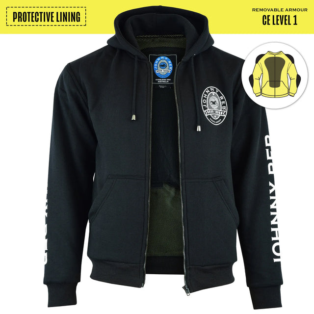 The full-zip design features a protective hood, dual front pockets, and embroidered Johnny Reb branding on the left chest and sleeves. Includes CE Level 1 (EN 1621-1 2012) removable armour for elbows and shoulders, giving you the flexibility to customize your protection. Built for the road, designed for riders.
