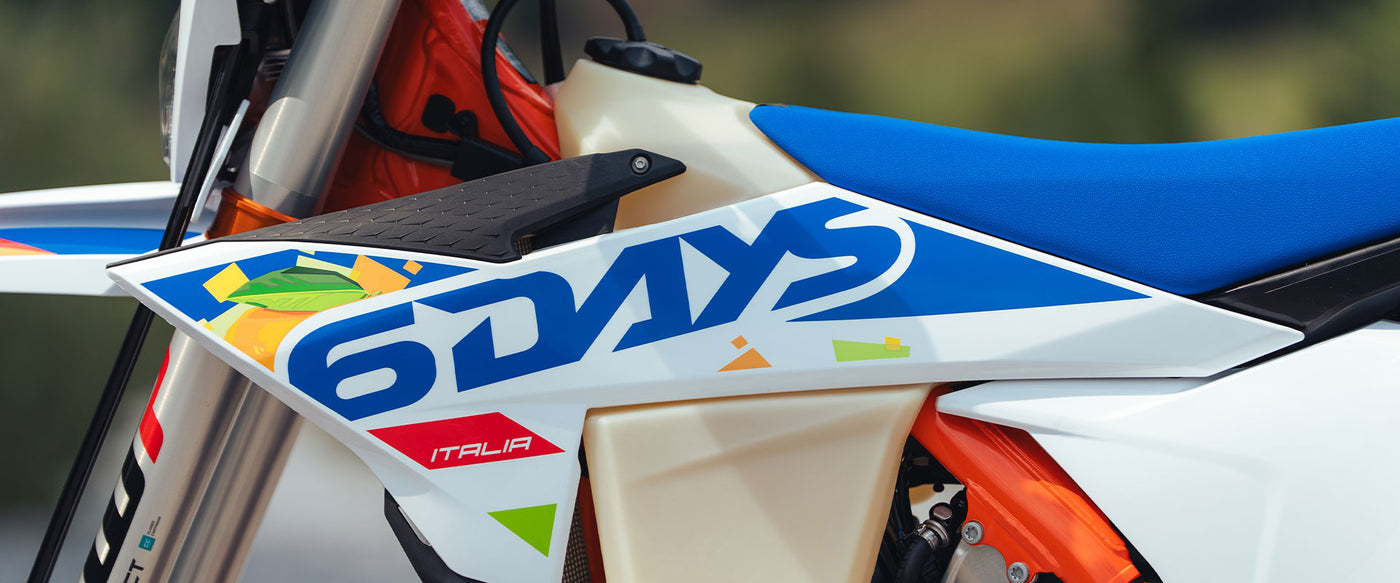 Exclusive Six Days enhancements elevate both performance and durability. CNC‑machined orange triple clamps, a Supersprox stealth rear sprocket, premium Metzeler 6 Days Extreme tires, and reinforced protection parts like skid plates and axle pullers bring race‑ready capability straight from the crate. High‑traction tires coupled with robust wheel construction ensure grip and control across mud, rocks, and loose dirt.