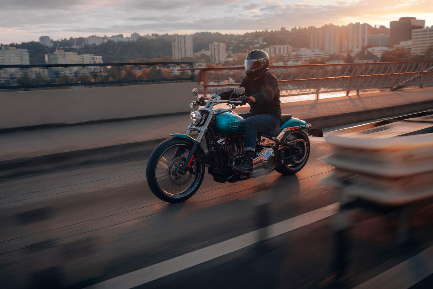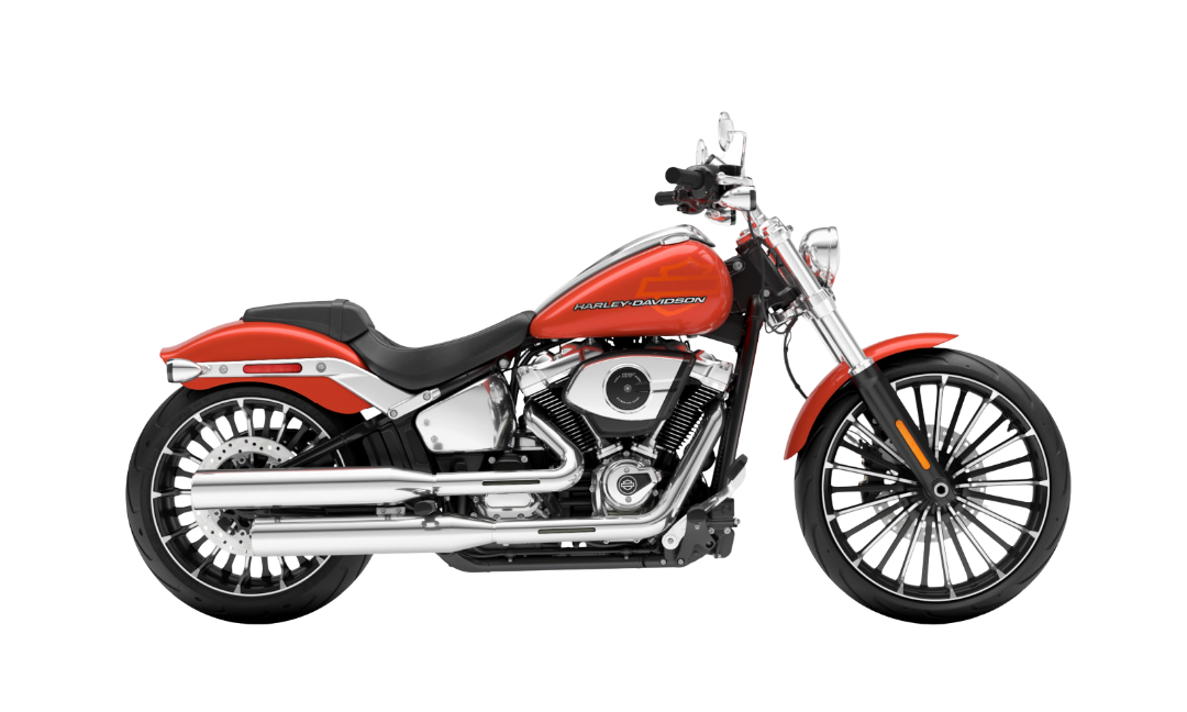 The Breakout’s low, stretched stance and signature frame rake give it a distinctive, aggressive profile that commands attention. A sculpted fuel tank, blacked-out finishes, and minimalist bodywork emphasize its performance-focused design, while premium components deliver both style and substance. The bike’s rear-set foot controls and ergonomic seating position offer a rider-forward feel, enhancing control and engagement on every ride.