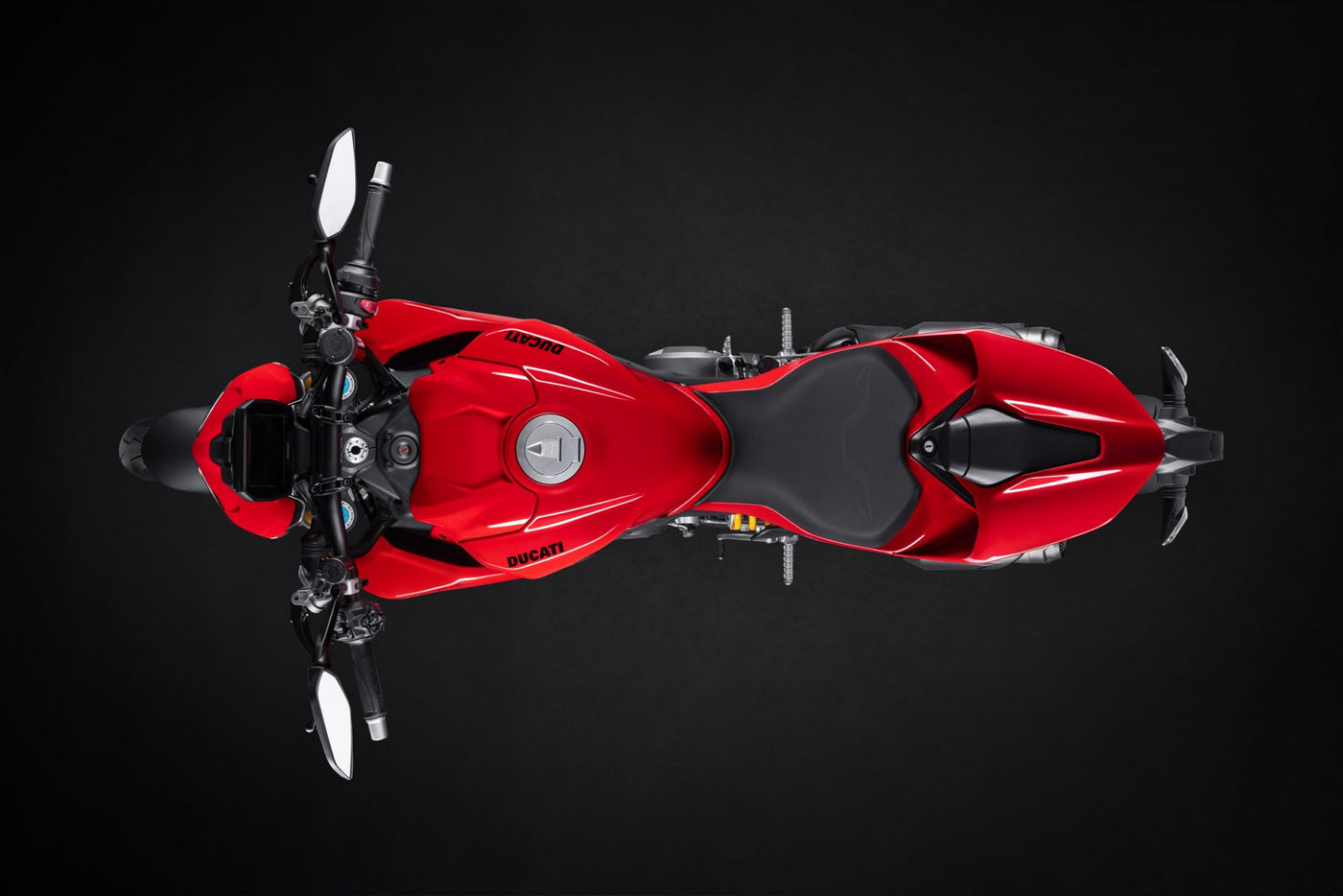 The rider triangle is redesigned from scratch to ensure versatility and control, without limiting track performance. The variable-section aluminium handlebar guarantees a secure grip and the ideal riding position. A seat height of 837 mm allows feet to safely and easily reach the ground, while the sculped tank ensures perfect feeling through every turn, particularly when hanging off the bike.