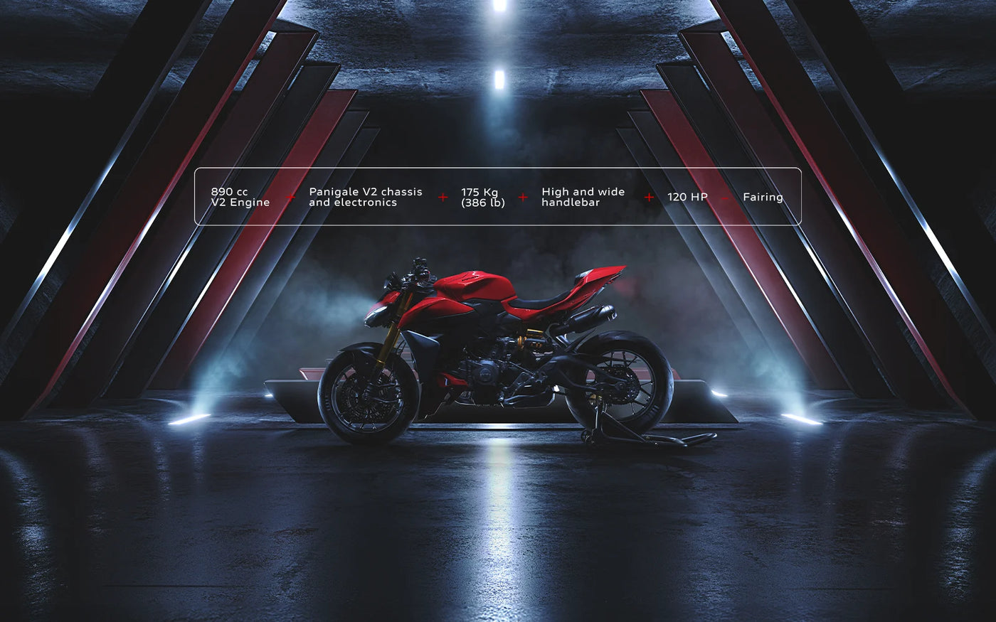 New 890 cc V2 engine. The chassis of the Panigale. 175 kg of pure adrenaline, with a high and wide handlebar. No fairings, no filters. The new Streetfighter perfectly embodies the original “provocative spirit”.