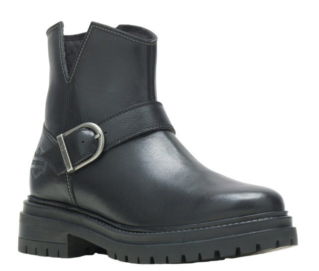These Harley-Davidson Westfield boots are made for those seeking quality and style. Made with tumbled full-grain leather, these boots feature H-D hardware on the buckle and a grippy lug outsole for added convenience. The YKK locking inside zipper and leather pull-tab make it easy to slip in and out of these boots. The polished leather and smooth rounded toe add to the overall look, while the engineer styled cross strap with logo buckle provides a unique touch. With a full-length textile lining and lightweight outsole, these boots are perfect for any occasion. Whether you're sitting or walking, these boots will ensure comfort. The heel counter has a debossed Bar & Shield logo and subtle contrast stitching on the heel counter, cuff, and open gore add to the style. The street-side outsole also features a Bar & Shield logo at the instep. These boots go well with jeans, miniskirts, midi-dresses, or even luxurious loungewear.