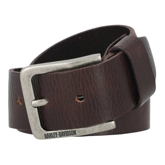 Harley-Davidson® Men's Embossed Leather Belt - Brown. This belt is tough and ready for the ride. Constructed from high-quality genuine leather. Features embossed Harley-Davidson® script in oversized letters. Matte 'Gunmetal' finish. Has interchangeable belt buckle.