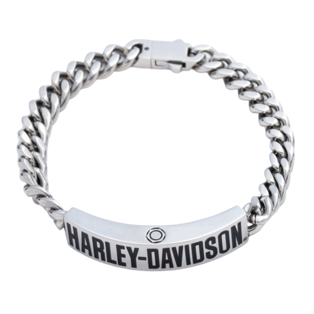 This Harley-Davidson Men's Curb Chain Bracelet is crafted from durable stainless steel with a black enamel plating for a sleek look. The secure push closer ensures that it will stay in place during all your rides. With a 9 inch size, this high-quality bracelet is designed to last ride after ride.